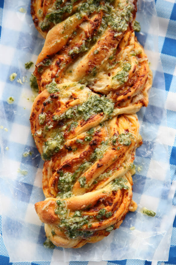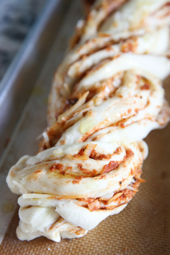- Since I used up all my filling in one loaf, I decided to fill my other loaf with something different. I had some left over Roasted Tomato Sauce in my fridge so I spread that on and sprinkled on some cheese and drizzled with Garlic Olive Oil before baking. When it came out of the oven I drizzled it with pesto. SO many possibilities with this great dough recipe and fun braiding method.