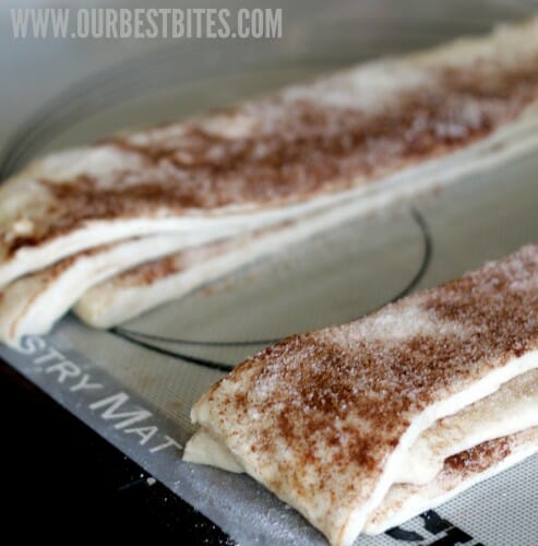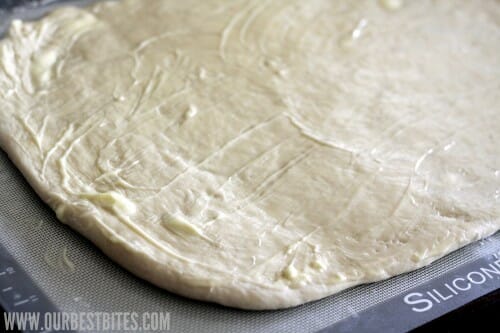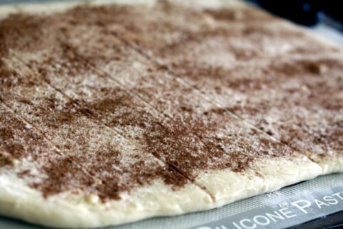 - Roll the dough out into a rectangle about 18 inches wide by 9 inches tall. Spread with 6 tablespoons of melted or softened butter. Sprinkle with ½ cup sugar and an even sprinkling of cinnamon.