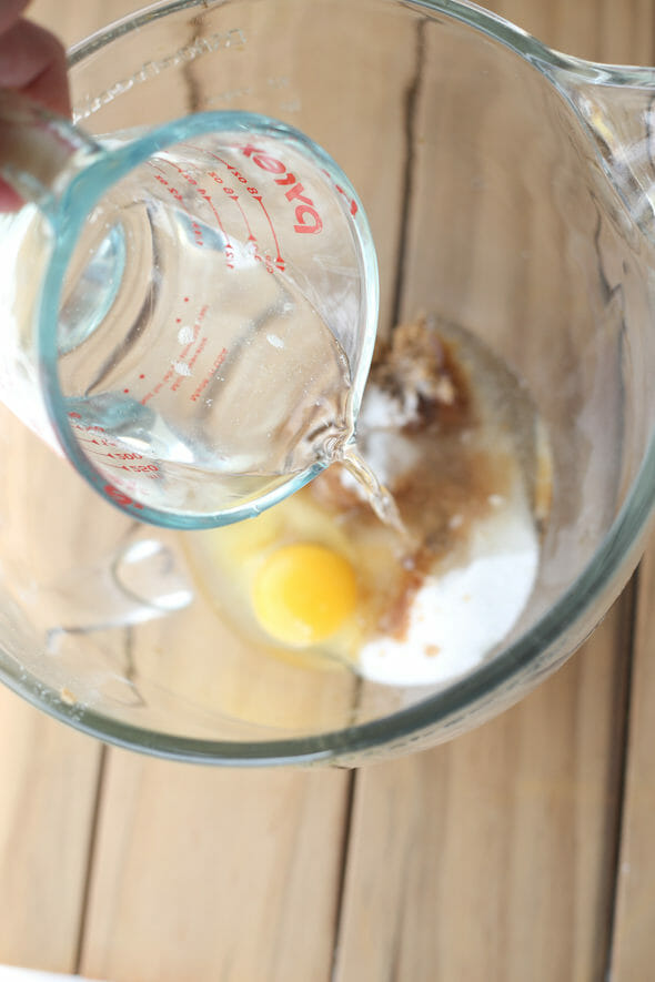 - In a mixing bowl, combine brown and white sugars, egg, vanilla, extracts, and coconut oil.