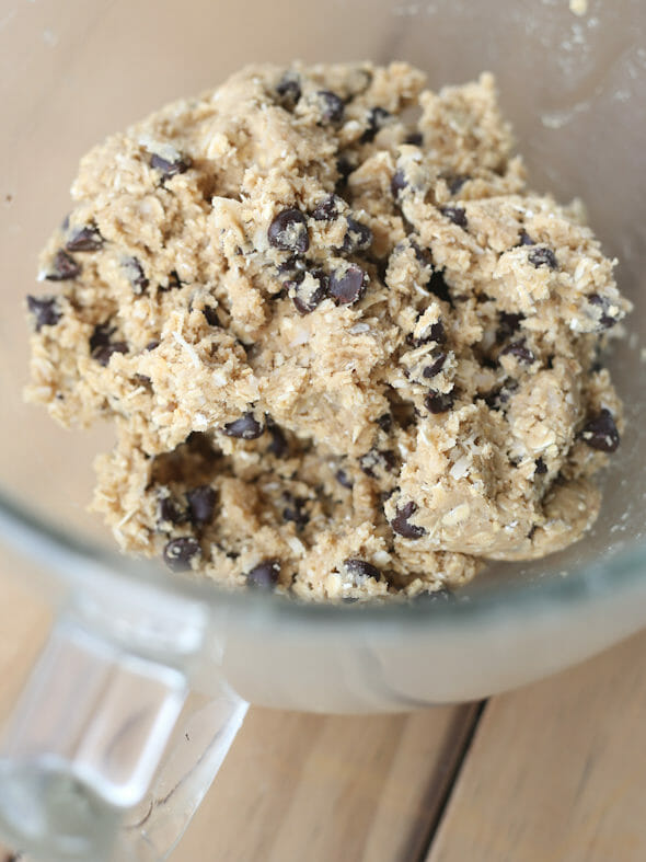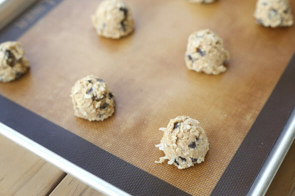 - When well combined, add in oats, coconut, and chocolate chips and mix until combined. Use a cookie scoop to portion dough into balls and place baking sheets.
