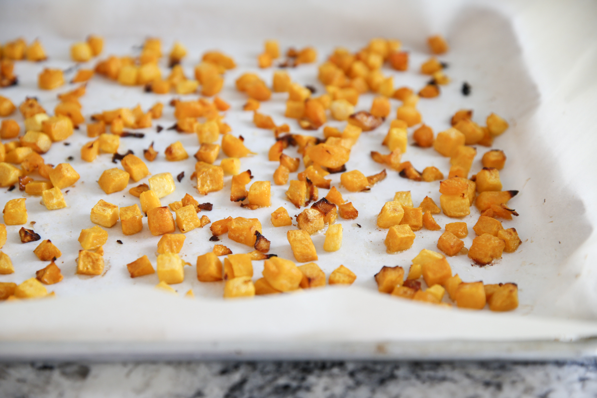 - Preheat oven to 450 ℉. Line a rimmed baking sheet with aluminum foil or parchment. Place the cubed butternut squash onto the lined baking sheet. Drizzle with 1 tablespoon olive oil and sprinkle with kosher salt and toss to combine.