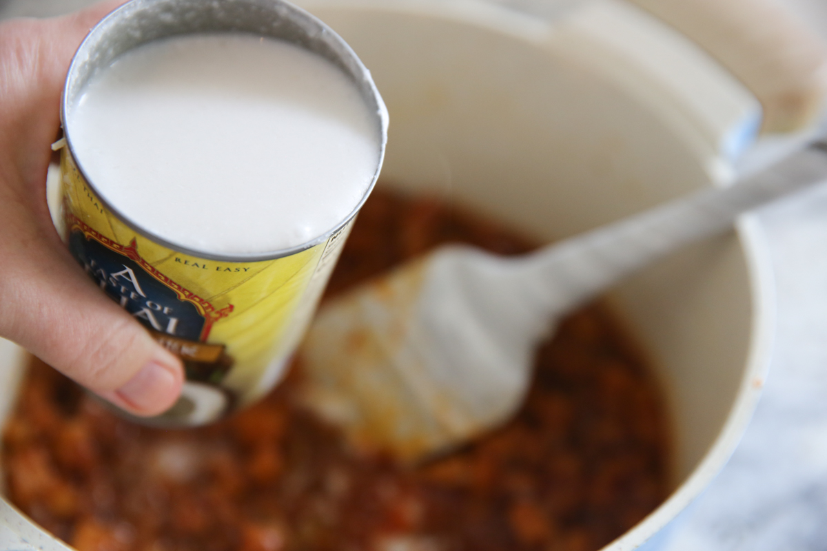 - Remove from heat and add some lite coconut milk and lime juice.