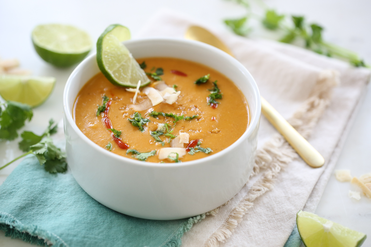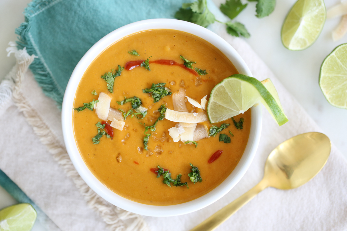 This coconut curry twist on traditional butternut squash soup is spiced up by red curry paste, coconut, lime, and cilantro. It might sound like an unlikely combination but it’s so surprisingly GOOD! It’s light and full of good-for-you ingredients. The coconut and butternut squash make the soup deliciously creamy and the fact the squash has been roasted gives it depth and dimension. It’s also vegan (if you use veggie stock) and makes a great light meal, side dish, or easy frozen and reheated lunch.