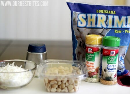 So anyway. Tropical shrimp. You’ll need a pound of peeled, deveined shrimp (tails on or off, totally depends on your preference), some all-purpose flour, garlic powder, onion powder, kosher salt, cayenne pepper (just a little bit), lime zest, 2 eggs, salted macadamia nuts (trust me here), and sweetened coconut.