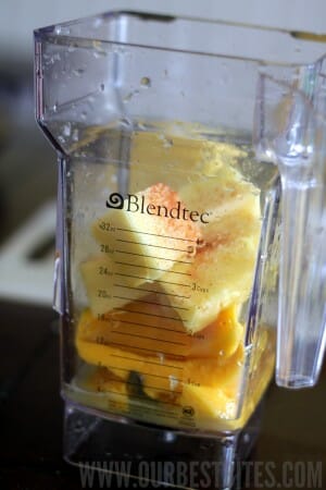 While the shrimp are cooking, make the sauce; you’ll need 1 medium very ripe mango, 1 cup pineapple chunks (I used fresh pineapple, but you could also use canned pineapple; it just might not be as sweet), the juice of 1 lime, a pinch of kosher salt and a pinch of cayenne (if you want a little kick).