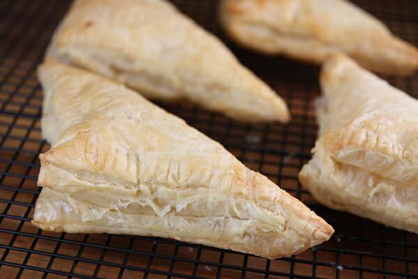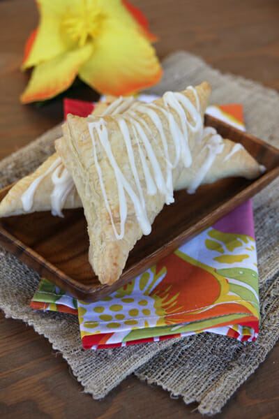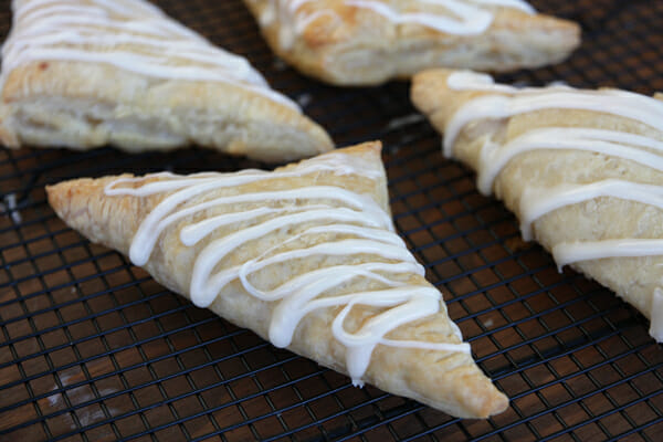 I put coconut extract as ‘optional’ in the glaze. You really only want a teeny bit in there, or the alcohol flavor in the extract will be a little too strong, so just don’t be too heavy handed with it. When the turnovers are just barely warm, not hot, drizzle the glaze over them. I like to let them cool to at least room temperature before eating.