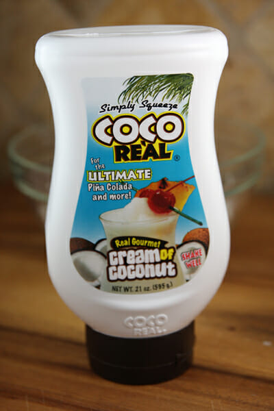 We use cream of coconut in a lot of our recipes, so it shouldn’t be too foreign by now! Don’t confuse it with coconut milk. Cream of coconut is thick and sweet with strong coconut flavor. You find it in the alcohol section of the grocery store (it doesn’t contain alcohol, though.) It will be either in a can or squeeze bottle near the mixers like pina cola and bloody mary mix. This recipe doesn’t use a whole lot of it, but don’t let that stop you from buying it, we have plenty of things to make with the leftovers!