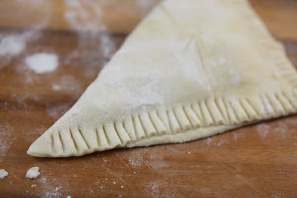 Dip your finger in water and run it along the edges of the pastry and then fold them in half and gently press the edges together. Use a fork to crimp, and also to poke once on top of each turnover.