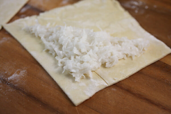 Divide the mixture evenly between your pastry squares. Place it on just one half and spread it out to the corners a bit, keeping it about 1/2 inch away from all edges.