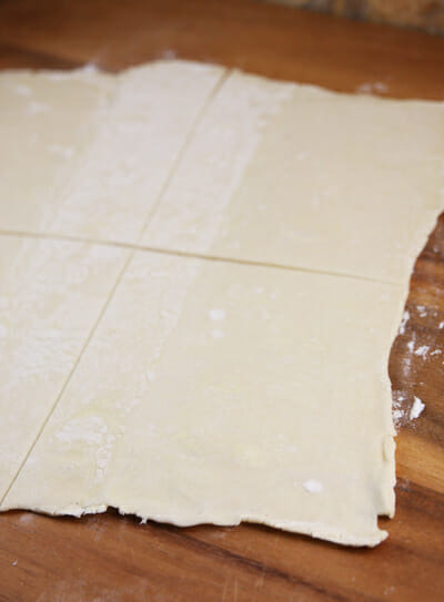 Thaw out the puff pastry dough according to package directions. Lay it out on a lightly floured surface and roll it out a little. You should have a square about 12×12 inches. Cut it into 4 equal squares (these are for large turnovers, you can certainly make smaller ones if you like).
