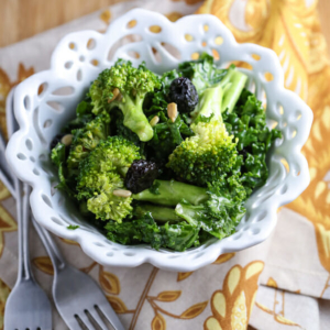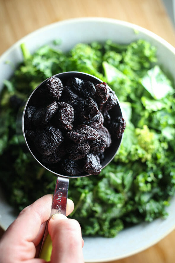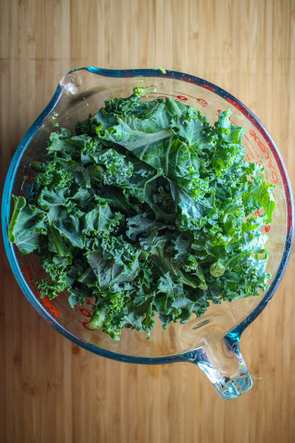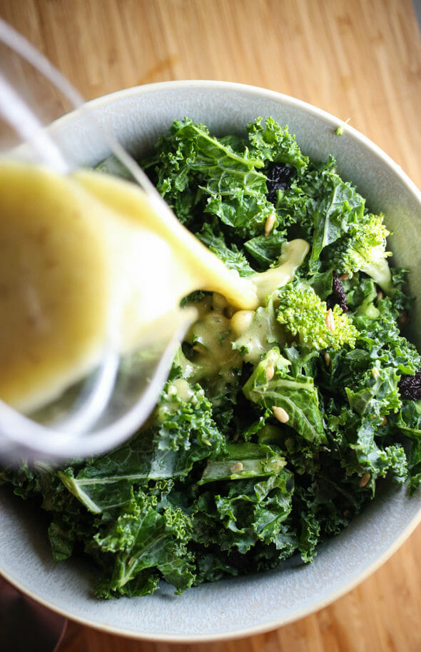 - Kale – One of the keys I discovered to not hating kale was to massage it. Just put the clean kale in a big bowl and grab it with your hands and scrunch it up until it’s softens a little. This helps break down the toughness and helps it hold onto the dressing a little better.
