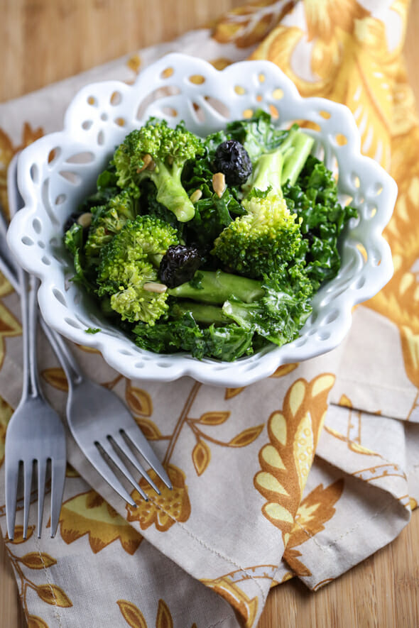 - Assemble the salad: Massage your clean kale in a large serving bowl to soften it a bit. Make sure your broccoli is broken into very small bite-sized pieces and toss those in. Then add some dried cherries or cranberries and some sunflower seeds.