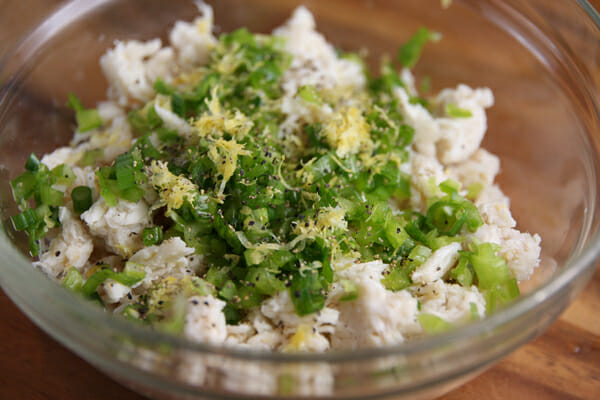 For the crab cakes, combine crabmeat with just a couple tablespoons of mayonnaise, some chopped green bell pepper and green onion and black pepper. I tweaked this recipe to include some lemon as well, because it goes so naturally with these flavors and brightens the whole dish. You’ll add the zest in the crab cakes and use some juice in the remoulade.