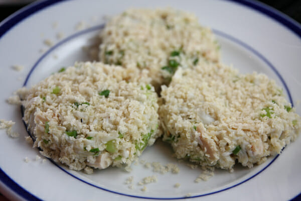 Dredge each patty in panko, covering both sides. I like to set the patty down in a shallow bowl of panko and press a little extra onto the tops.