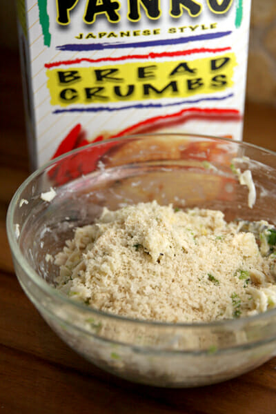Add a beaten egg and some panko bread crumbs. These two things act as binders to hold the cakes together.