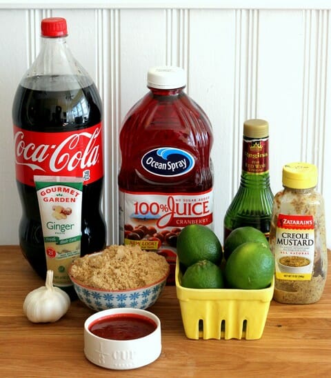 You’re going to need NON-DIET Coke (or Pepsi…I guess…), cranberry juice (100% juice, not juice cocktail), brown sugar, freshly squeezed lime juice, red wine vinegar, fresh garlic, fresh ginger, Creole mustard (or other mild grainy mustard), and some canned chipotle sauce. Try and find a small can of just plain chipotle sauce that doesn’t have the peppers in it–it tends to be milder and it’s easier to measure out what you need.