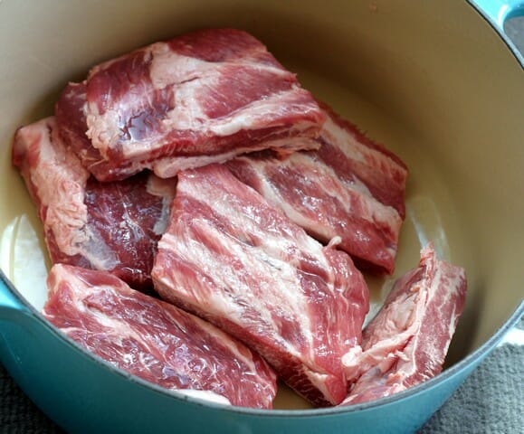 If you’re making these in the oven, preheat oven to 300. Cut the ribs into portions that have 2-3 bones per portion. Place in a heavy lidded pot or Dutch oven (don’t use a baking dish covered with foil–it won’t retain enough heat and the ribs won’t be as tender) or in the crockpot.
