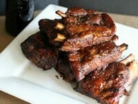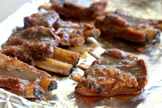 and cook on the heated grill or under the broiler for 3-5 minutes or until the ribs are shiny and glazed. Flip the ribs and brush the opposite side with the remaining glaze and cook for another 3-5 minutes, being careful not to scorch the ribs. They should just be fall-off-the-bone tender.