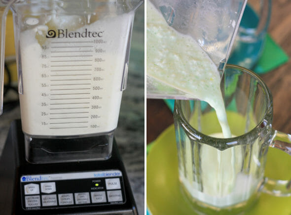 - You’ll start with some ice in your blender. Add in some half and half and cream of coconut. If you want to make it green, add a couple of drops of green food coloring. Blend that all up and pour into some glasses.