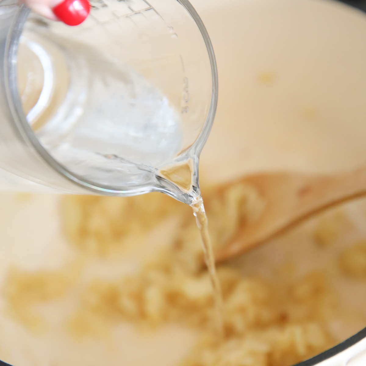 - Add flour and stir to combine to coat the onions. Add water very slowly while whisking until completely combined and there are no lumps.