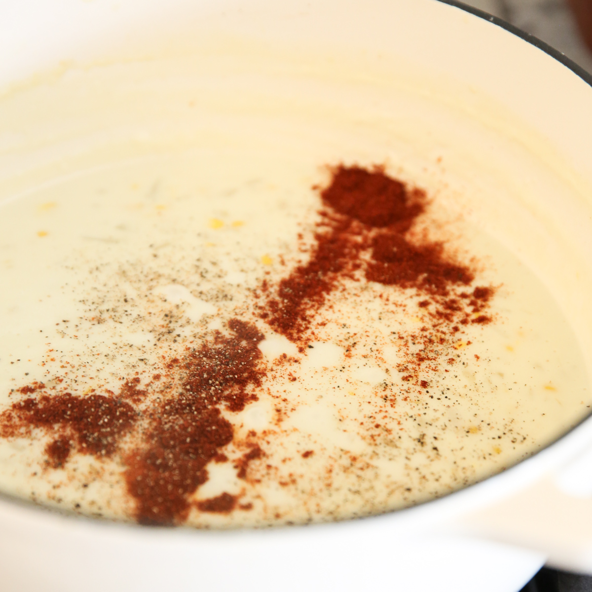 Note: Smoked paprika is an optional ingredient here. I absolutely love the smoky flavor it adds to soups, especially if you’re leaving out the bacon. Just be aware it adds a peachy orange color to the soup- which I don’t mind, but if you want your soup to stay creamy white then you’ll want to leave it out. The photo above does not include the smoked paprika, and the photos below do, just for reference!