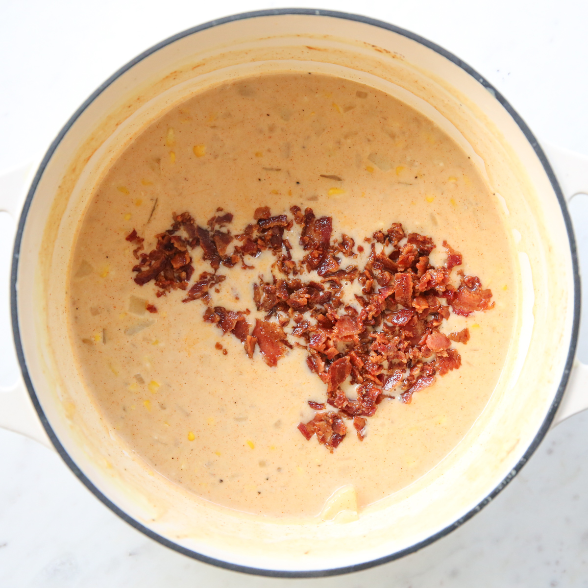 - Add crumbled bacon and corn (and smoked paprika if you’re using) and heat through.