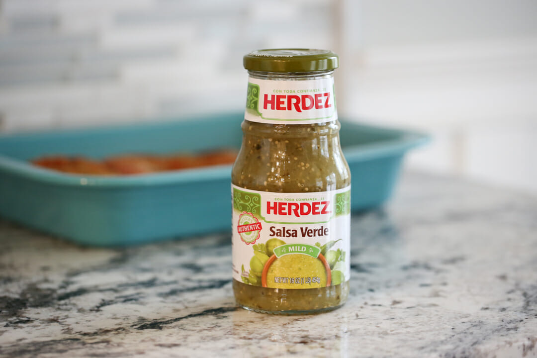 - Green salsa – The main flavor component here is green salsa. It’s a great shortcut ingredient because it has things like tomatillo, lime, cilantro, onion and garlic already in the jar. However, not all green salsas are NOT created equal. One of the biggest factors is the heat level. Even different bottles of the same salsa can sometimes taste different and have different heat levels. If you like spicy food, feel free to use a spicy green salsa. For my family, I always make sure to buy something labeled mild. As an example, Herdez is a common grocery store brand that’s easily found in grocery stores that my family loves (pictured below). Green enchilada sauce can also work in a pinch!