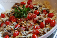 - Put it all together! Place pasta in a large bowl and combine with as much sauce as you need. Place tomatoes and mushrooms on top and sprinkle on lots of fresh parmesan cheese. Sprinkle pine nuts on top and serve.