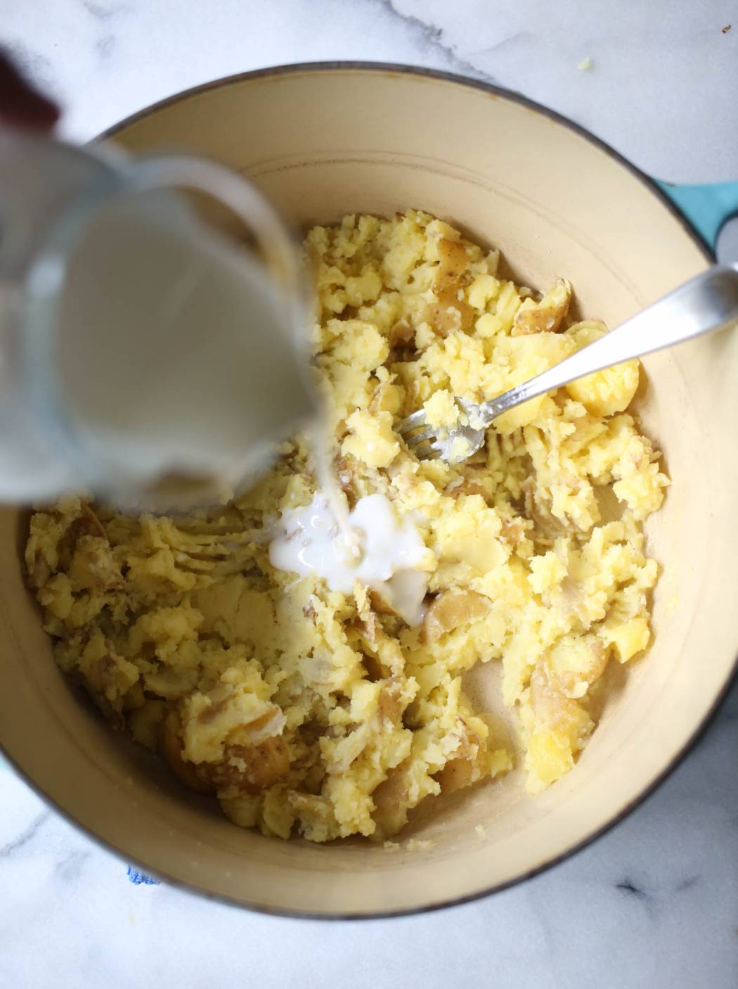 - Drain the potatoes and then transfer back to the pot. Add 3-4 tablespoons of butter and begin mashing with the back of a fork to incorporate the butter.