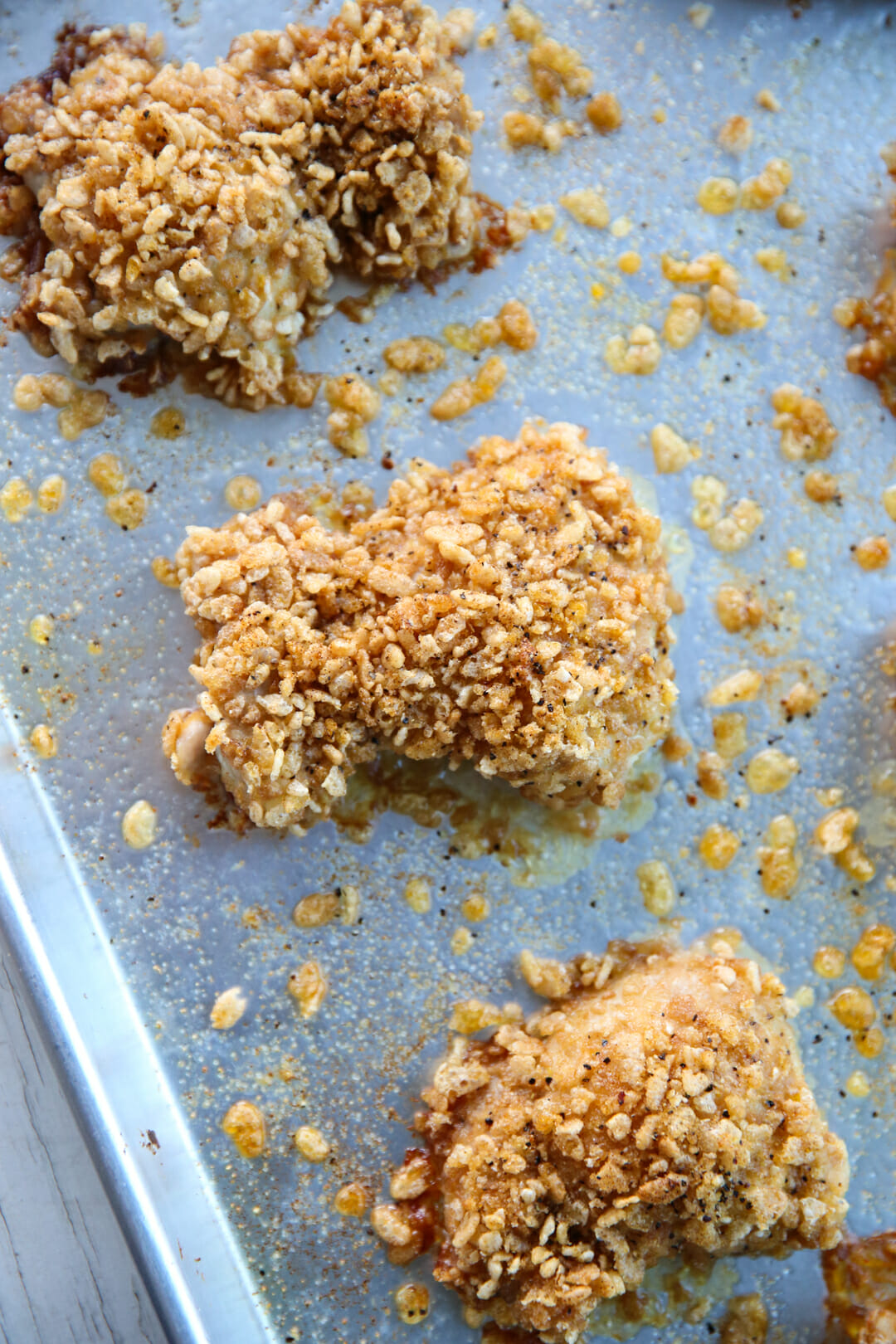 When I was little my most favorite part of this meal was after dinner when everyone was going back and forth clearing the table and every time we passed by the pan on the counter picking off those little crispy, salty baked-on bits. Because those Rice Krispies are so delicate, they are able to soak up a little butter and turn into the most buttery crunch. It combines with the savory seasonings and the bite of tender chicken and the whole thing is just perfection.