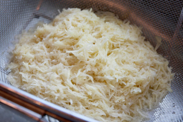 - Drain potato shreds and rinse and dry the bowl that was used and set aside. Place potato shreds and grated onion in the center of a tea towel or several layers of cheese cloth. Twist loose material to secure the bundle, and squeeze firmly to remove excess liquid from the shreds.