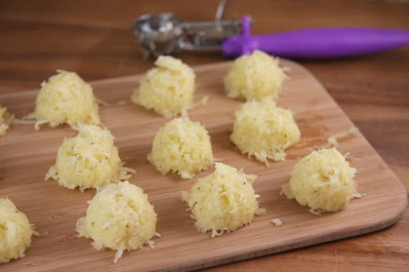 - These are bite-size latkes so you just need a rounded tablespoon of potato mixture. To get nice even amounts, I just used my cookie scoop.