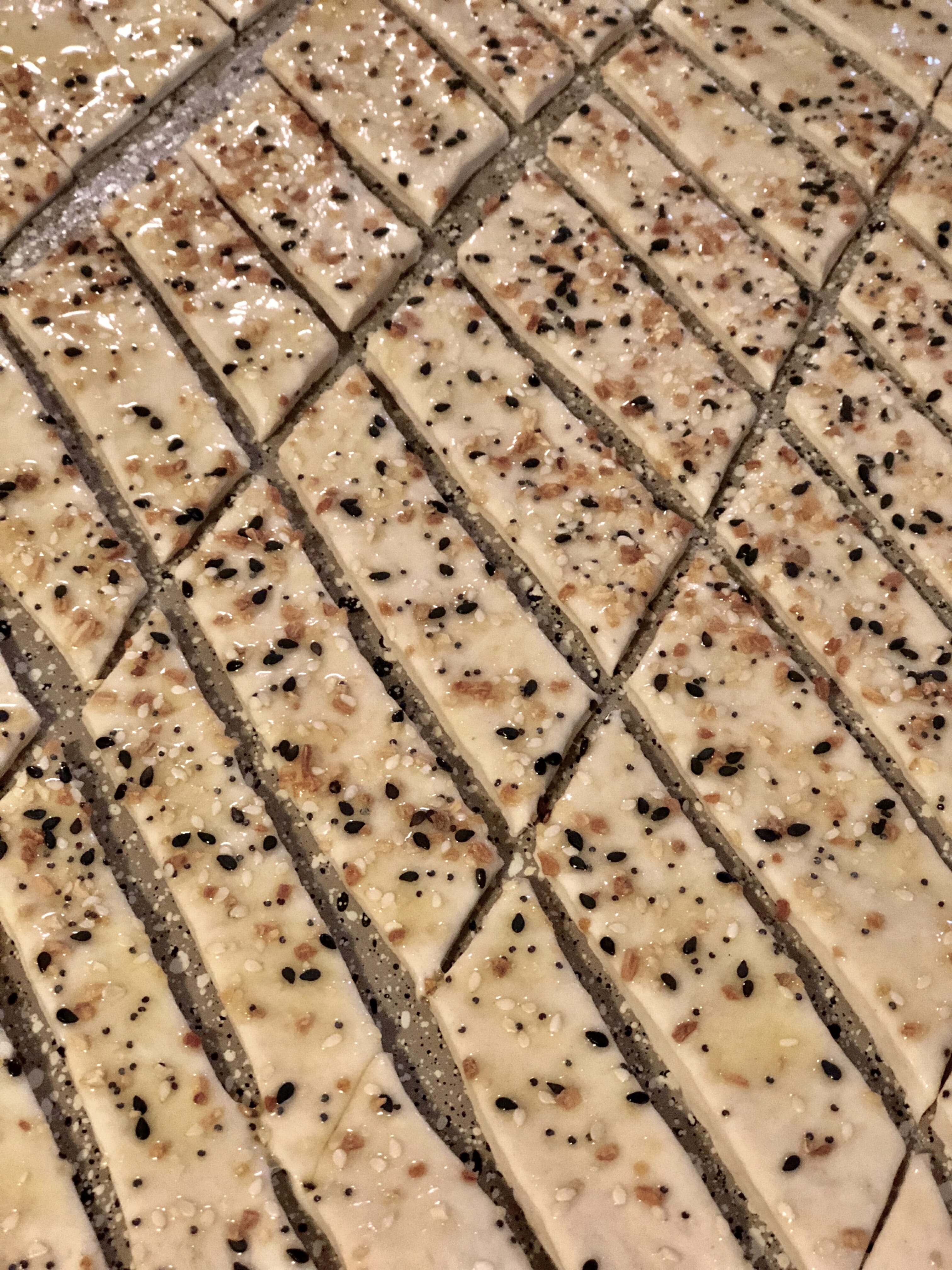 - Remove the dough from the bowl and place on a surface lightly sprayed with cooking spray (or dusted with flour). Roll the dough until it is as thin as possible without  tearing. Whisk together the egg and a splash of water and brush over the dough (this will make your croutons very crunchy--if you'd rather them be a little softer, brush with olive oil). Sprinkle with Everything Bagel Seasoning and use a pizza cutter to cut the dough into strips. Carefully transfer the strips to the prepared baking sheets and place  both sheets into the oven at the same time (if you'd like, you can rotate which one is on top and which is on bottom halfway through, but you don't have to). Bake for 10-12 minutes or until golden and crispy. Remove from oven and allow to cool before serving. Delicious sprinkled on salads but also when served like crackers--feel free to dip them or just eat them like a snack!