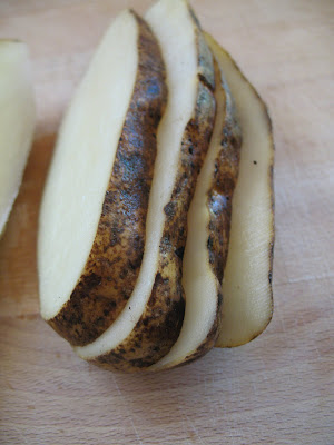 1. Start by cutting your clean potatoes into 1/4 inch slices.
