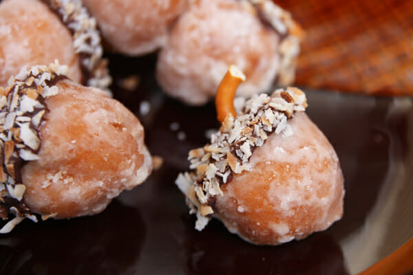You forgot the magic for the donut hole acorns… NUTELLA! because we all know that everything tastes better with Nutella on it! 🙂 And I am going to have to make these for my husband to give out to his staff… they will read “from acorny boss” haha! It will be great as he is the master of the pun! Thank you so very much for sharing!!