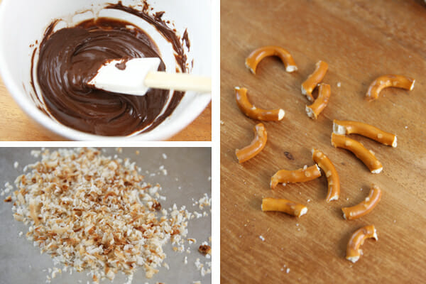 I’ve used sprinkles, mini chocolate chips, toffee bits, chopped toasted coconut, and more. I’m using coconut here. - And then just use a little piece of a pretzel for the stem. Ta-da! Instant cuteness. These are fun for party food, or nestled in a cute box for a little gift. PS: Doughnuts dipped in chocolate and toasted coconut are amaaazing.