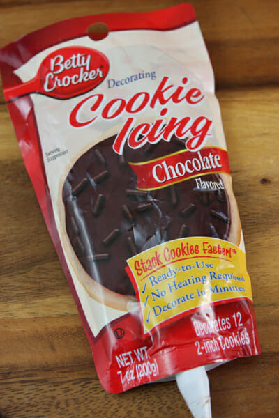 - Frosting – You can use store bought decorator’s frosting in a tube or pouch, homemade frosting, or even a chocolate paste made with a little softened butter, powdered sugar, and cocoa powder (just eyeball, you need very little).