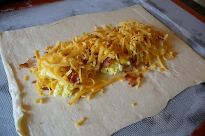 • Next, use a rolling pin and a lightly floured work surface to roll out the crescent dough to about 10 in x 12 in. Lay the eggs down the center of the rectangle, leaving room on both sides and the 2 ends. Top with bacon, cheese, and a couple shots of hot sauce if you want.