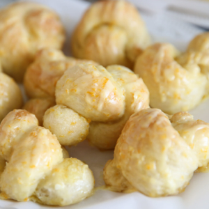 These rolls are best eaten fresh. If you need to plan ahead, allow the dough to thaw, roll each piece in orange sugar and tie in a knot, then cover in plastic and place in the fridge for up to 24 hours. When ready to bake, pull the rolls out, keep covered loosely with plastic, and allow to rise 30-40 minutes until puffed and risen, then bake.