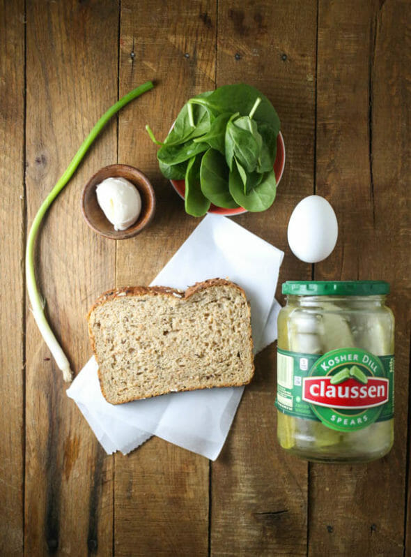 - Toast a slice of bread. While that’s toasting, chop the egg, pickle, and green onion, and place in a bowl.