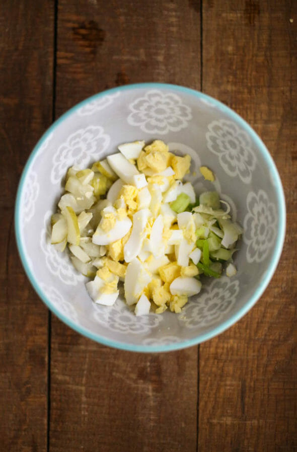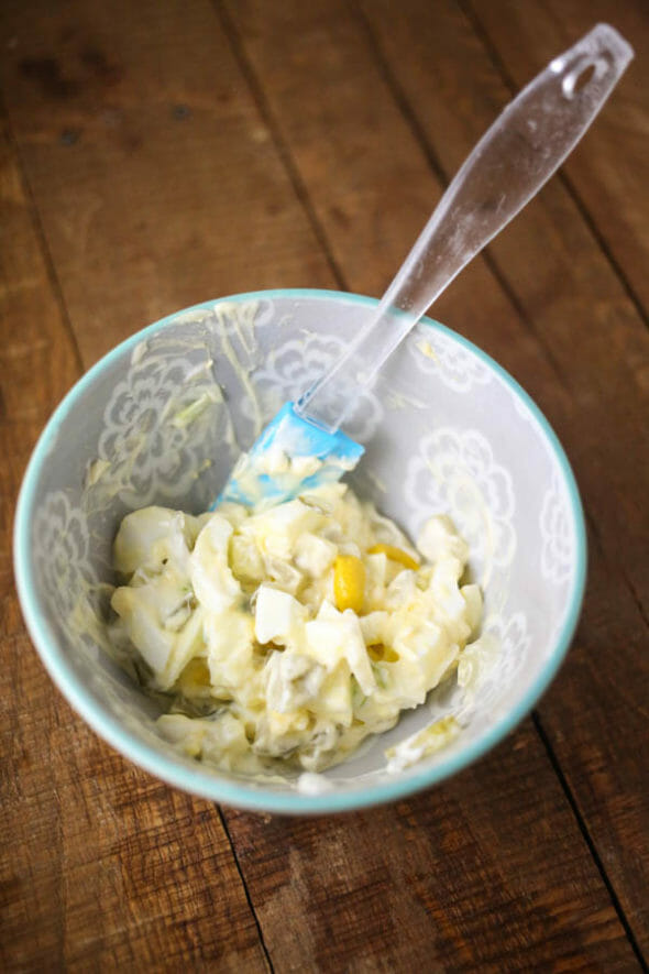 You could either mix it all up and then add the bread or you could keep the eggs/pickle/onion separate from the mayo and then mix it up and put it on the bread when you’re ready to eat it. 🙂