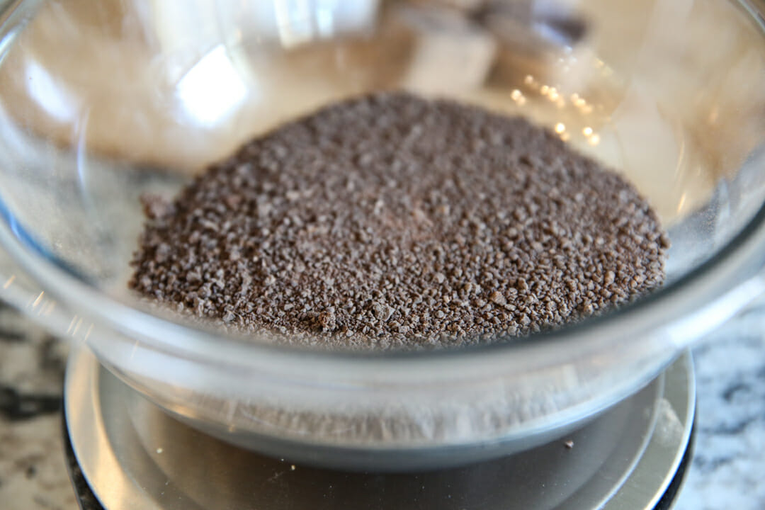 Let me show you how! Start with chocolate (duh!) and melt it along with some butter. I’m using a grated chocolate here because it melts so easily, but you can use chocolate in any form since you’ll measure by weight.