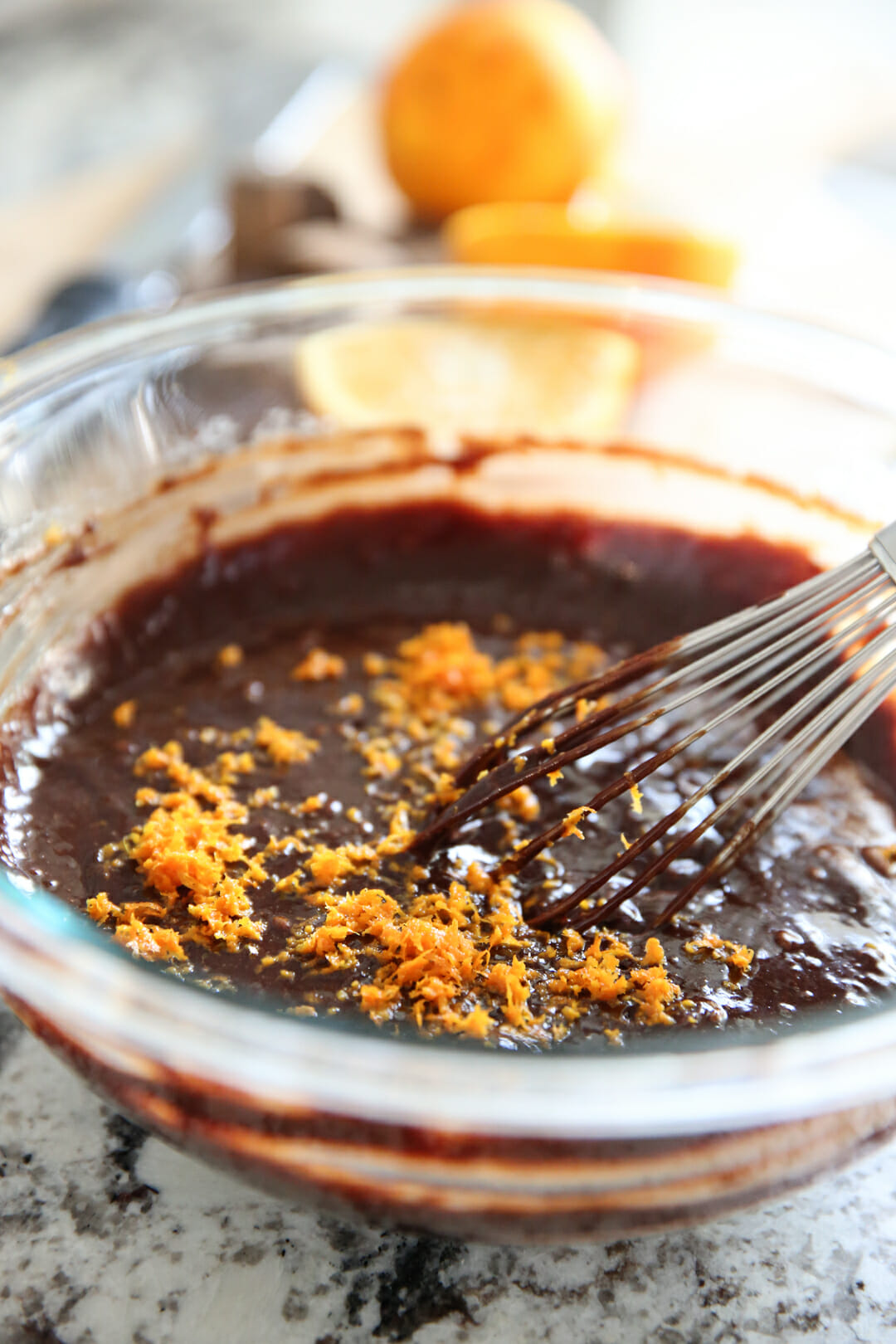You’ll mix the chocolate and butter with eggs and sugar and that’s it! That’s the magic batter. 4 ingredients, people. I add a generous amount of freshly grated orange zest right into the batter.