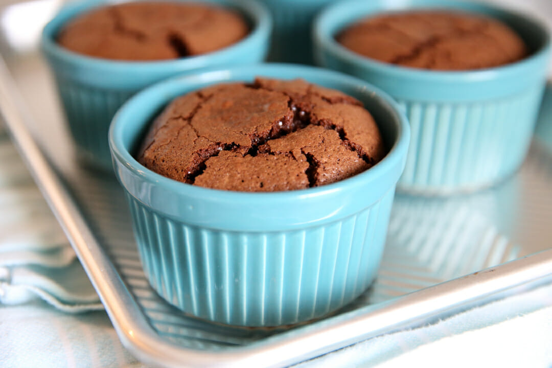- Transfer batter to ramekins, filling 2/3 full. Bake for 25-35 minutes, until tops are set and a skewer poked in cakes comes out moist and slightly fudgy but not wet.