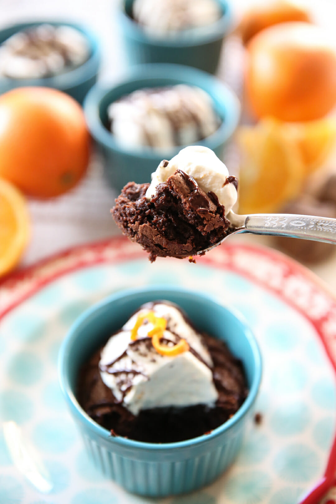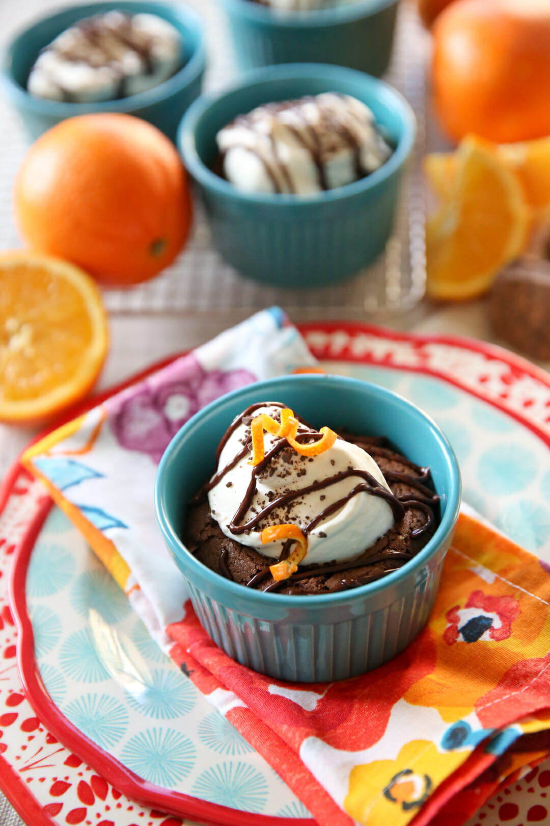 Your spoon will crack through the slightly crunchy top and then pull out a rich, moist, fudgy interior. The orange in the whipped cream cuts through the richness and balances every bite. These are fabulous in small quantities so feel free to make them in a smaller ramekins. I’ve included notes in the recipe notes about options, there. These would be a fabulous end to a holiday dinner!