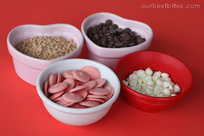 Since it’s V-day soon I decided to pretty mine up with some holiday lovlies. You can use chocolate (any type), almond bark, candy melts, etc. and then sprinkle on any toppings you want. My favorite combo is chocolate with toffee bits sprinkled on. They taste a lot like one of my favorite cookies.