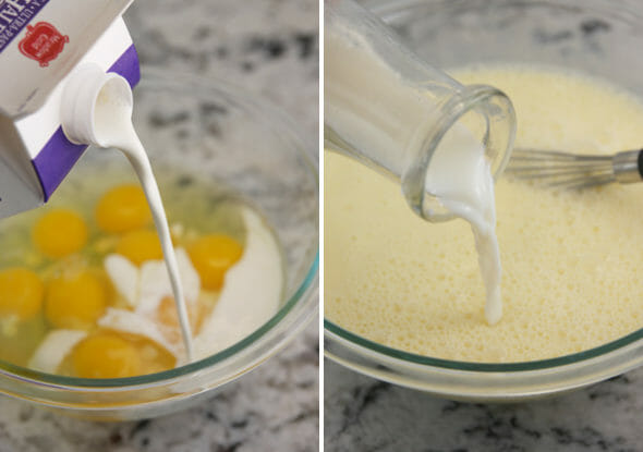 - Crack eggs into large mixing bowl and whisk to combine. Whisk in half and half and milk. Add brown sugar, cinnamon, salt and vanilla. Set aside.