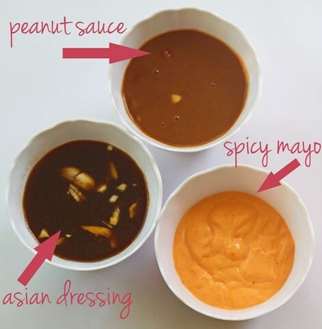 The first thing to do is to make your dipping sauces. I made 3 that are pretty different, and you can mix and match them however you want to. First, I made that spicy mayo that you sometimes get on spicy sushi rolls. Then I made a sweet and savory peanut sauce and an Asian-inspired vinaigrette.