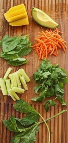 In this picture, I have avocado, mango, basil, shredded carrots, cucumber, cilantro, and mint. Off the top of my head, here’s a more complete list of ideas for fillings:
