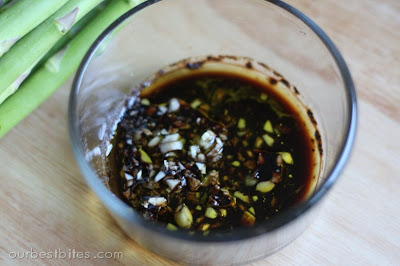 - In a small bowl, combine salt, pepper, oil, vinegar, and garlic. Drizzle over asparagus and toss to coat.